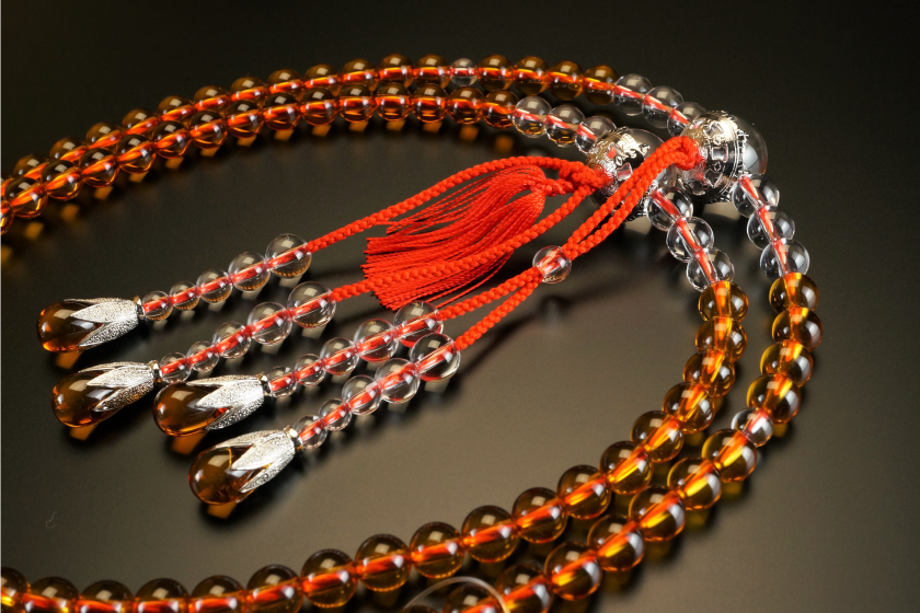 (株)神戸珠数店 琥珀 御影念珠 銀飾り水晶仕立